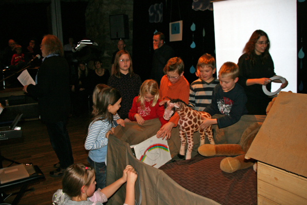 Der Chor hatte den Abend im Horber Kloster dem Thema Noah gewidmet und Stücke, die zum Thema passen, erarbeitet. Zunächst wurde die Zeit vor der Sintflut beschrieben, dazu trug der Chor schwarze Kleidung. Die Zeit der Sintflut wurde in den blauen Gewändern symbolisiert. Als nach der Sintflut die Sonne wieder aufgeht, singt der Chor in Regenbogenfarben.